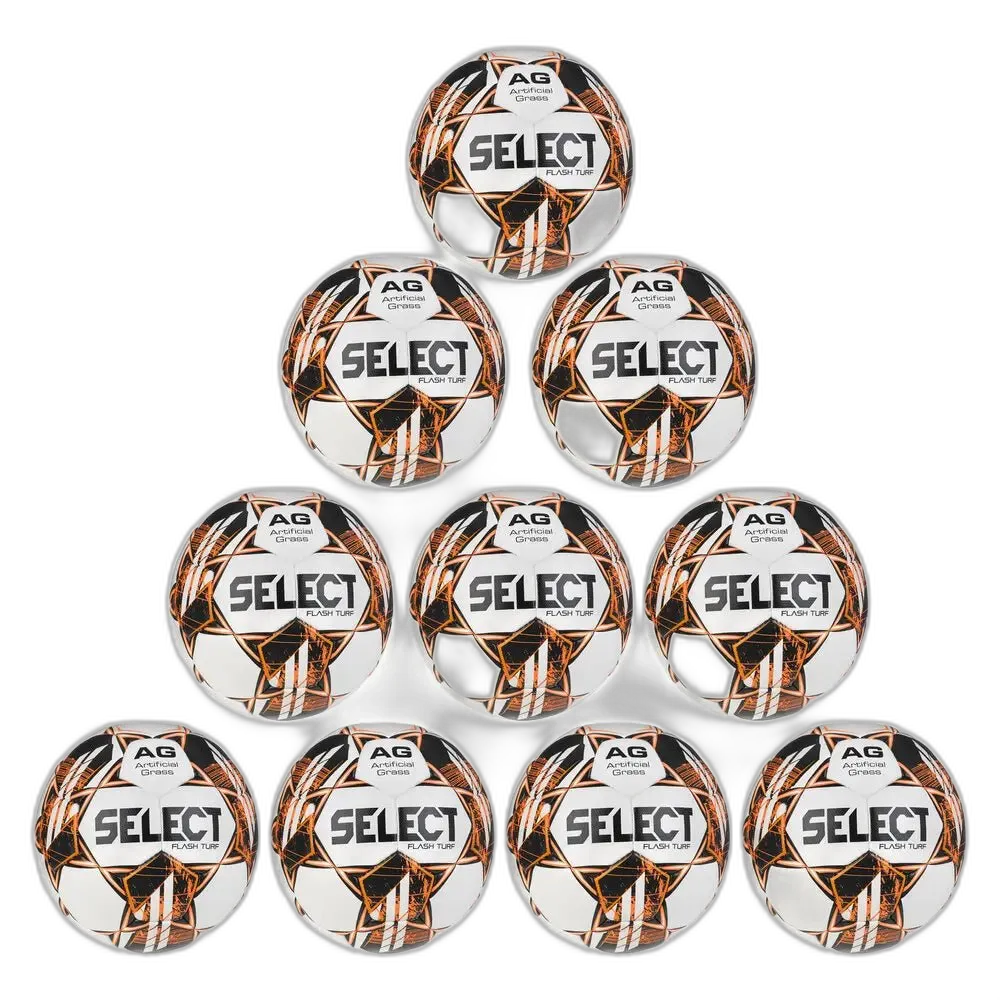 Fotballpakke Select Flash Turf. En kvalitetsball for kunstgressbaner. Et nytt, sterkt og holdbart PU-syntetisk lærmateriale med granulert overflate gjør den lett å kontrollere, også under våte og fuktige forhold. Fotballen har fire lags underfor og patentert Zero Wing blære.